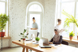 Concentrated. Portrait of a beautiful arabian businesswoman wearing hijab while working at openspace or office. Concept of occupation, freedom in business area, leadership, success, modern solution.
