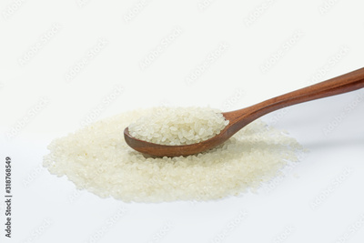 Wooden spoon scoop rice on white background.