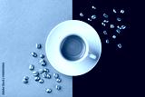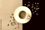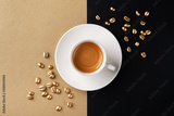 Cup of coffee and coffee beans on gold black background. Creative flat lay. Top view.