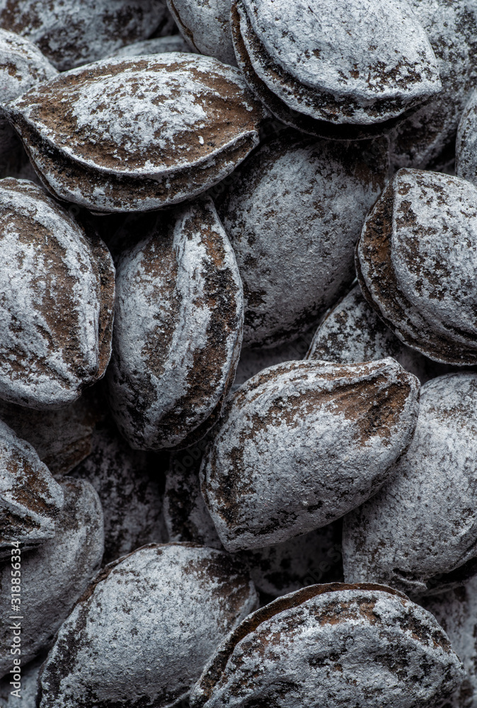 Unpeeled roasted apricot kernels, in a round wooden bowl