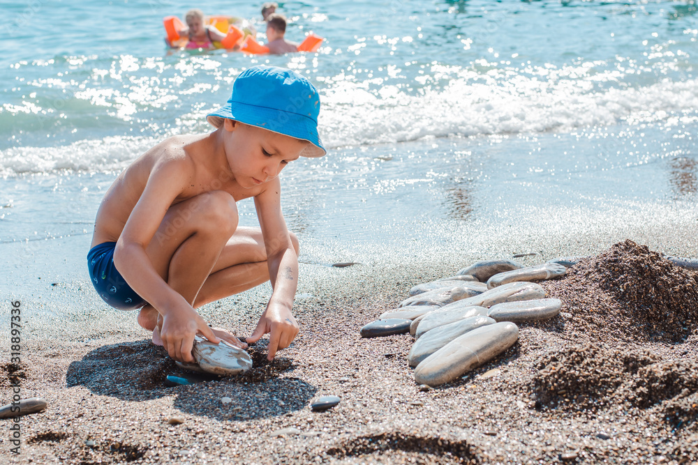 little baby boy playing on the beach by the sea in sand and stones. Build sand castles.
