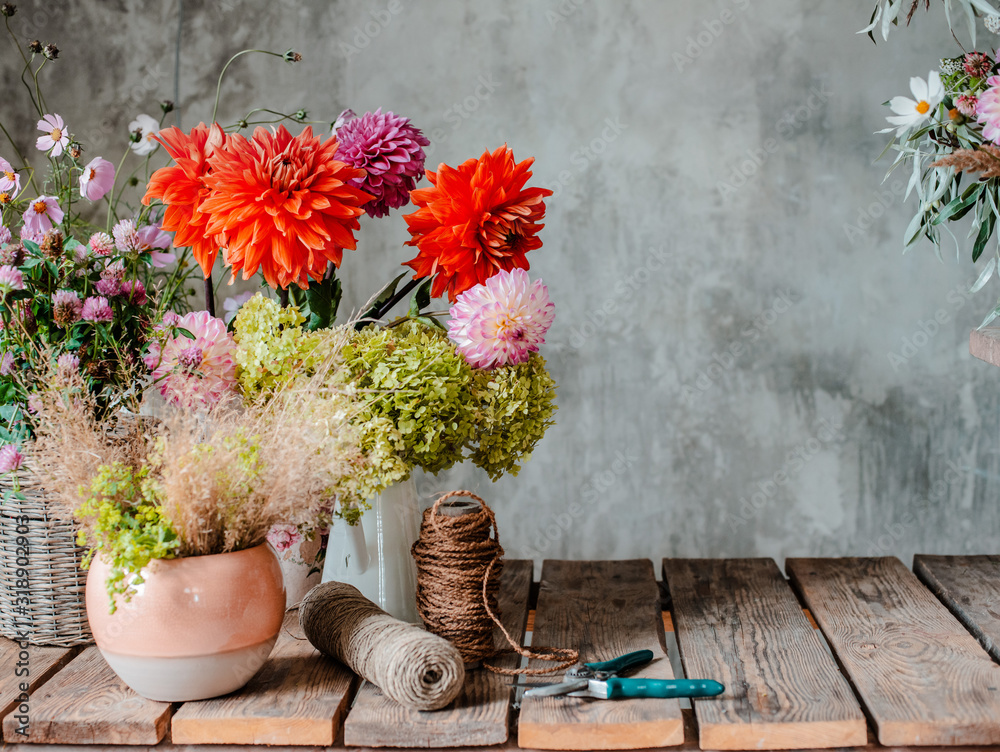large floral arrangement bouquet on the desktop florist on the background of a concrete wall