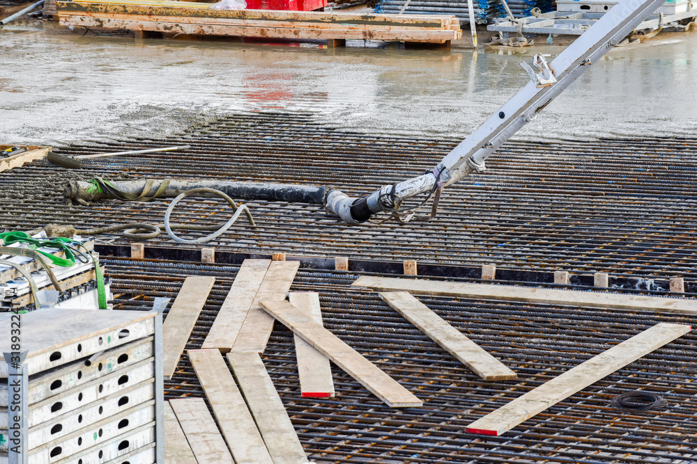Pouring cement to make reinforced concrete over rebar on a working construction site during a new building project