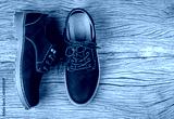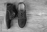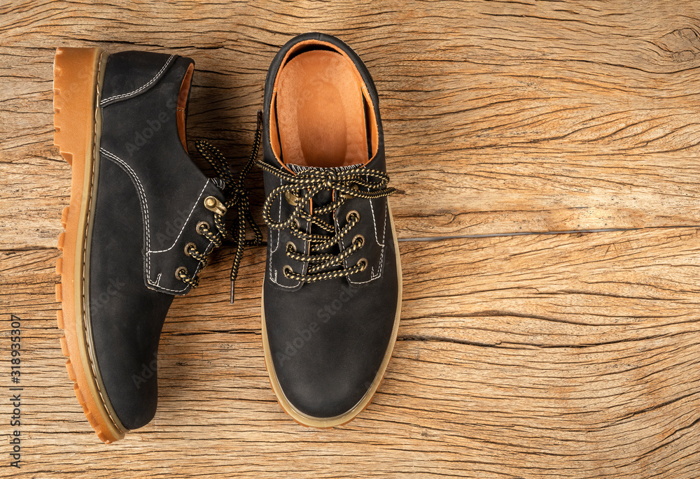 Black leather shoes on brown wooden floor background with copy space on the right.