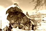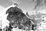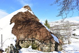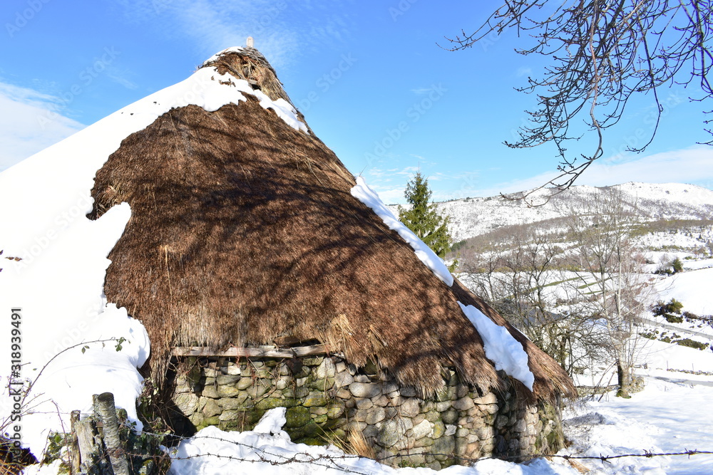 Famous Piornedo mountain village after a snowfall with ancient round Palloza stone houses with thatched roofs. Ancares, Lugo, Galicia, Spain.