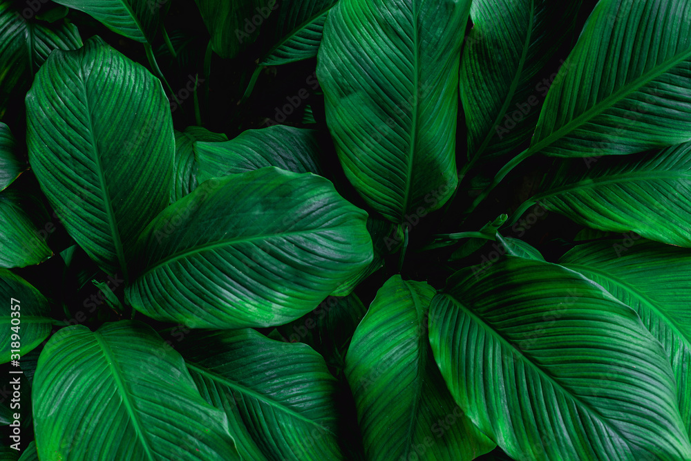 leaves of Spathiphyllum cannifolium, abstract green texture, nature background, tropical leaf
