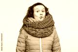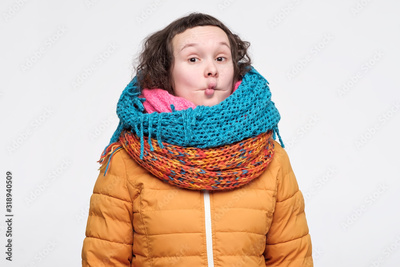 Young woman in several scarfs making funny grimace looking at camera with sad expression