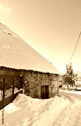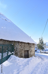 Ancient snowy Palloza round stone house with thatched frozen roof and icicles. Piornedo mountain Village, Ancares, Lugo, Galicia, Spain.