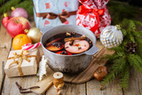 Christmas red wine mulled wine with spices and fruits on a wooden table. Winter concept. Traditional hot drink for Christmas. Mulled wine with citrus, apples and spices in a pan. Autumn concept.
