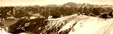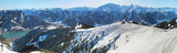 Aerial panoramic view of Zell am See and Kaprun tourist resort with green winter lake, snowed evergreen forest, sunny Alp mountain summits and white skiing slopes from the highest point