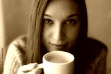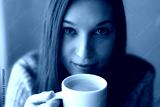 Beautiful girl on a winter morning drinking coffee, close-up.