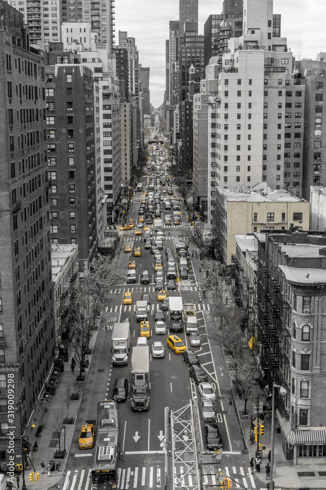 Iconic view of 1st avenue, new york city in black and white with yellow cabs shot from the Rosevelt cable cart
