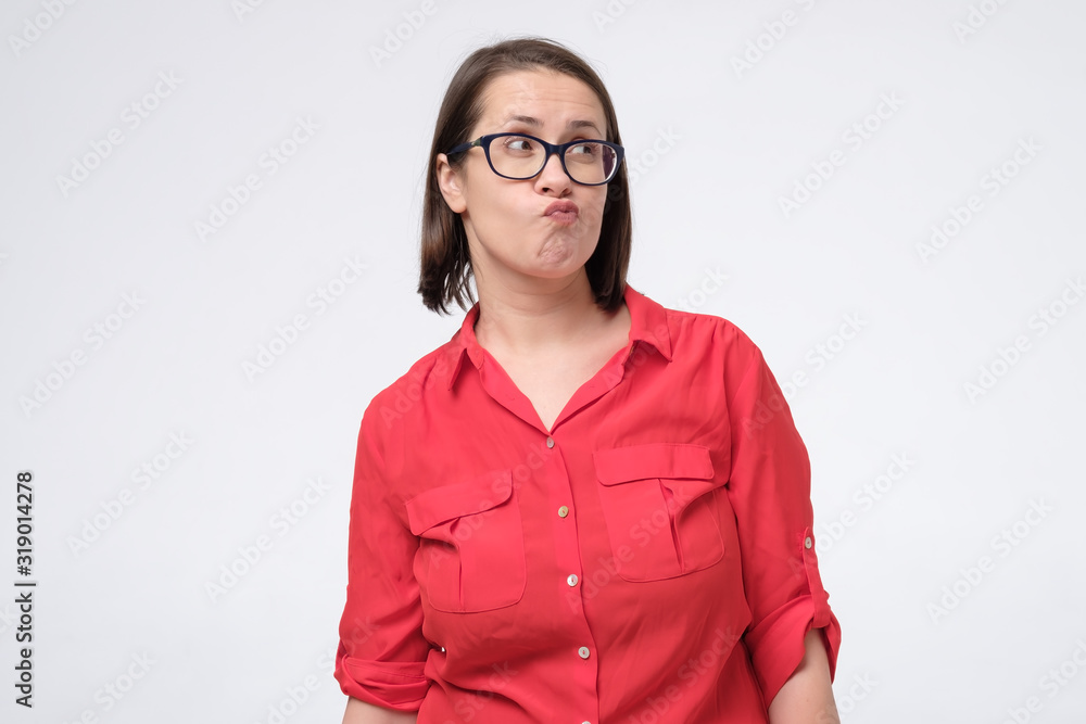 Pretty brunette woman with glasses frowning her eyebrow while looking aside
