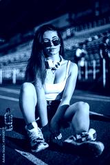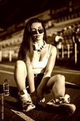 Stylish woman posing for the camera sitting on running track.