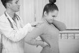 Young woman suffering from back pain, having her spine examined by experienced doctor