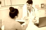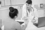 Professional plastic surgeon showing silicone breast implants to his female patient. Unrecognizable woman preparing for breast augmentation