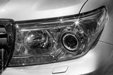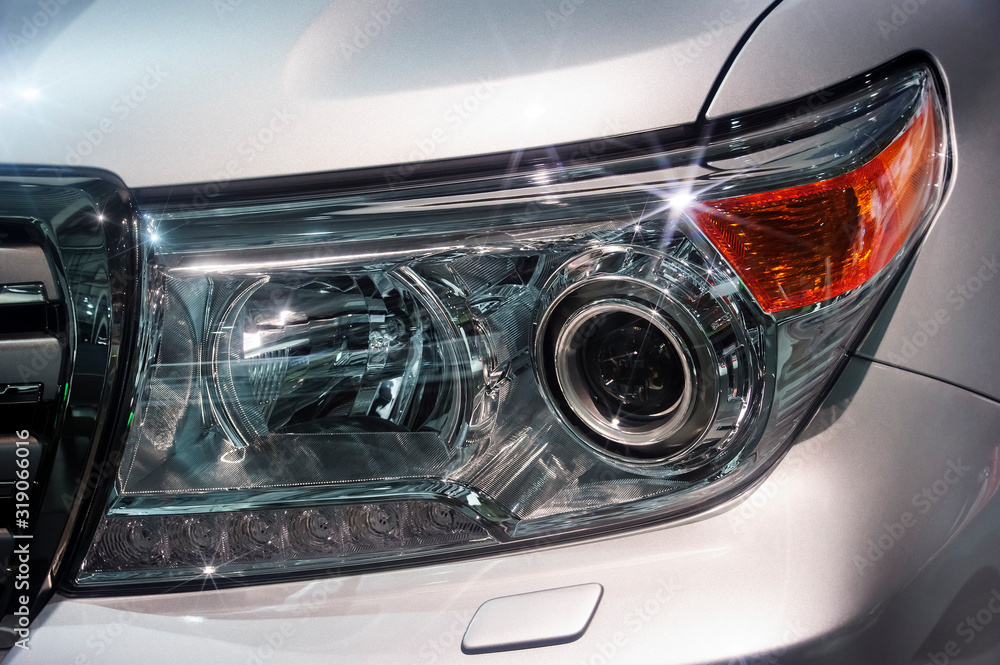 Car headlight with led and xenon lamps of modern powerful offroader vehicle with silver gray bodywork, automobile industry