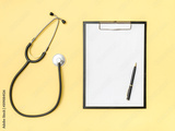 Doctor's desk top view. Stethoscope and notebook on a colored background