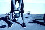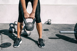 Kettlebell weightlifting athlete woman lifting weight at outdoor fitness gym. Lower body legs and feet closeup of strength training legs, glutes and back lifting free weights.