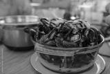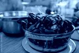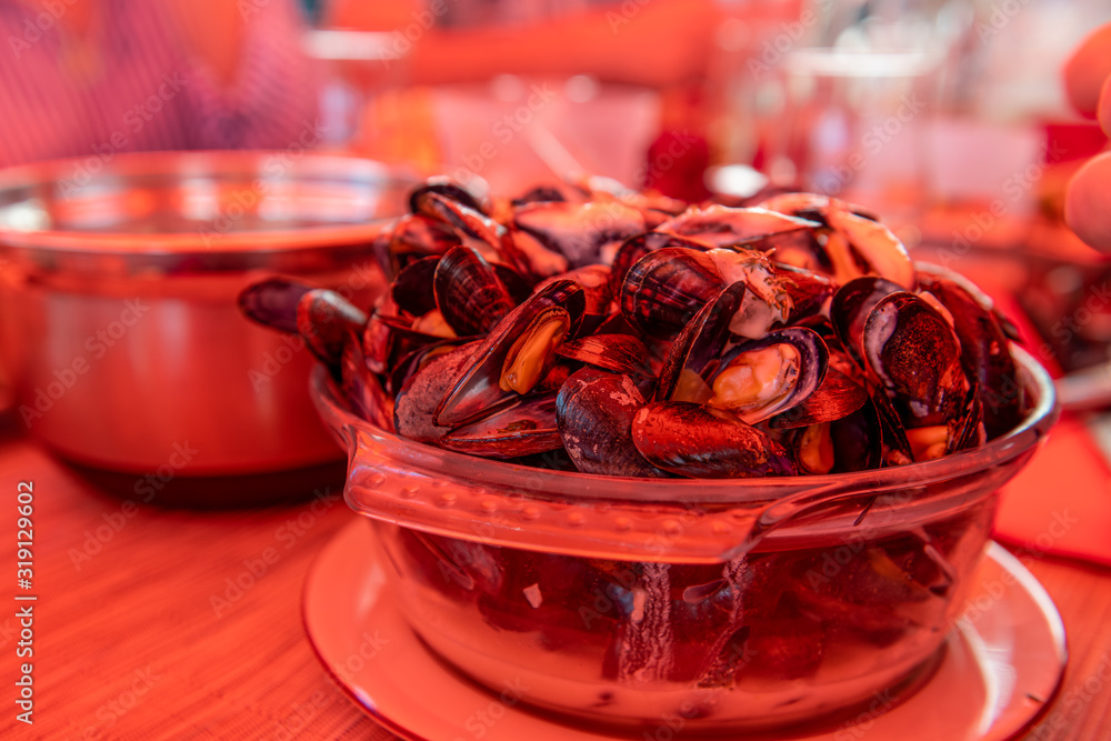Święzo ugotowane małże podane w szkalnym naczyniu w restauracji