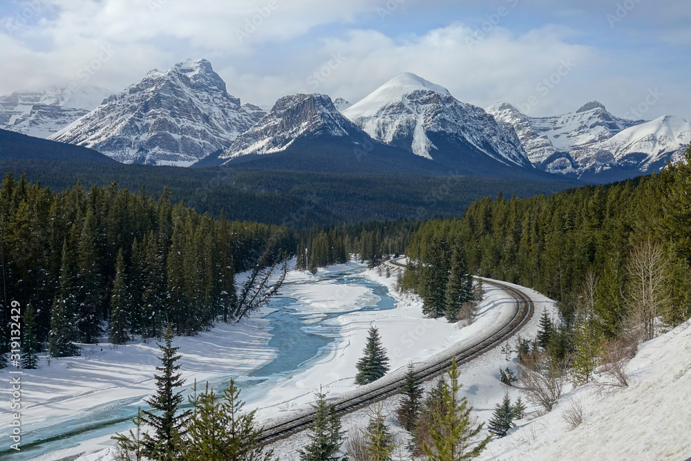 AERIAL: Flying above a snowy spruce forest covering valley under the mountains