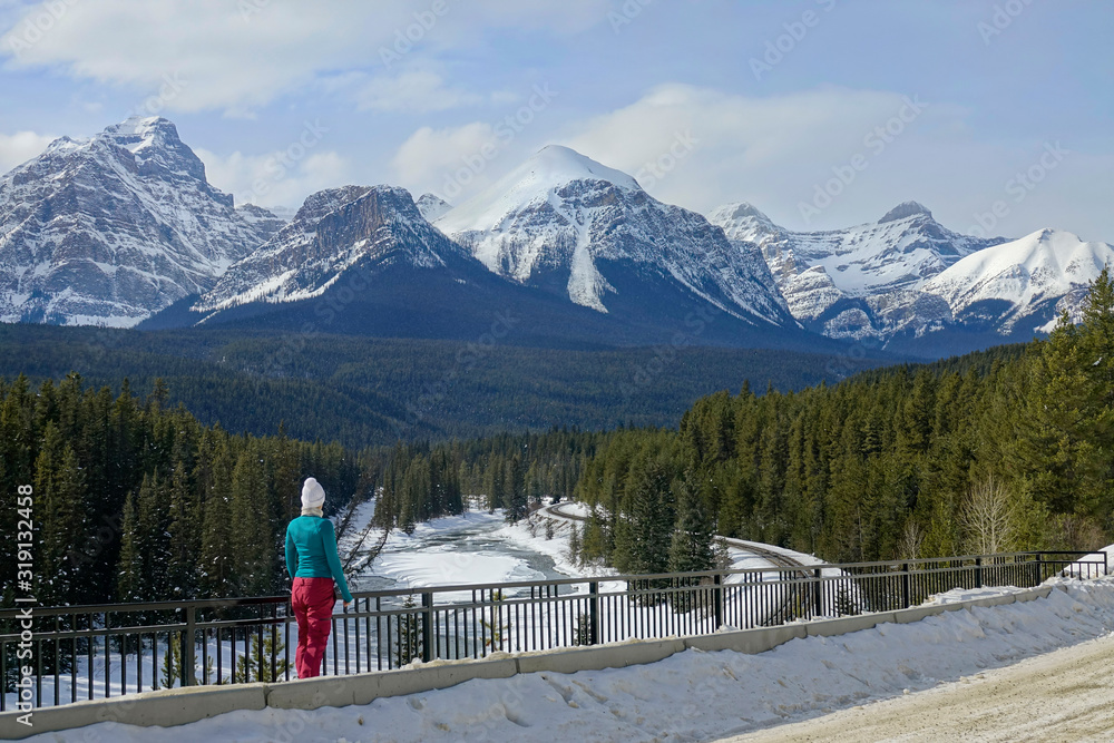 COPY SPACE: Woman stands by the side of a road and observes wintry landscape