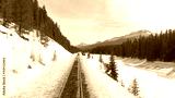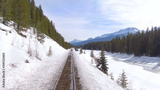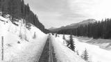 DRONE: Scenic view of snowy mountains while flying along a river and railway