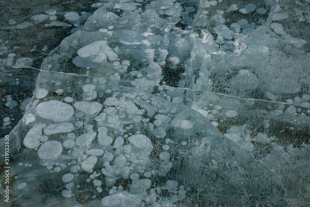 CLOSE UP: Air bubbles are trapped under ice covering a big lake in Canada.