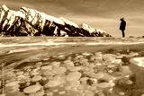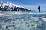 CLOSE UP: Woman exploring the Canadian Rockies observes the fascinating icy lake