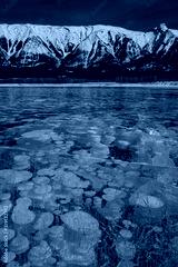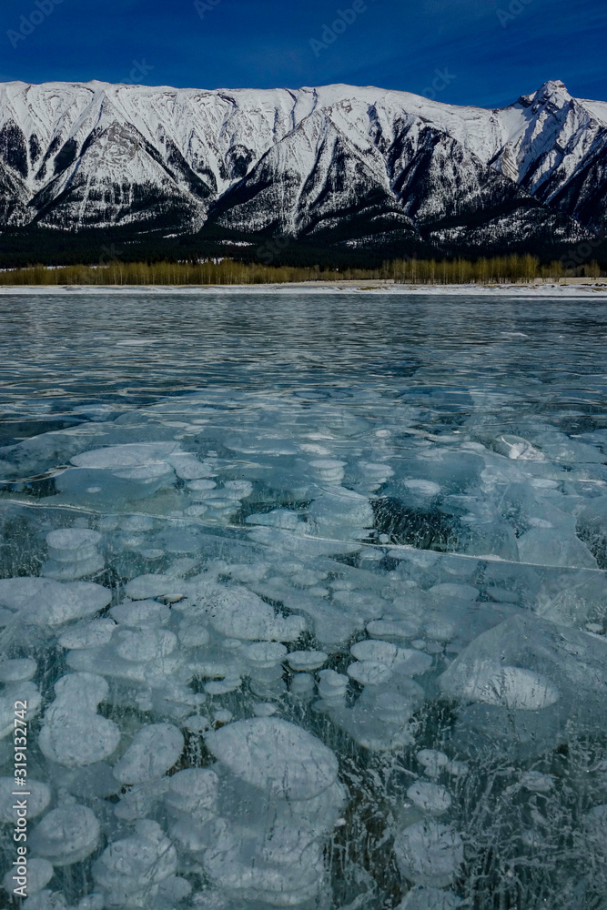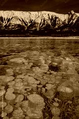 VERTICAL: Crystal clear Lake Abraham is surrounded by snowy Canadian Rockies.