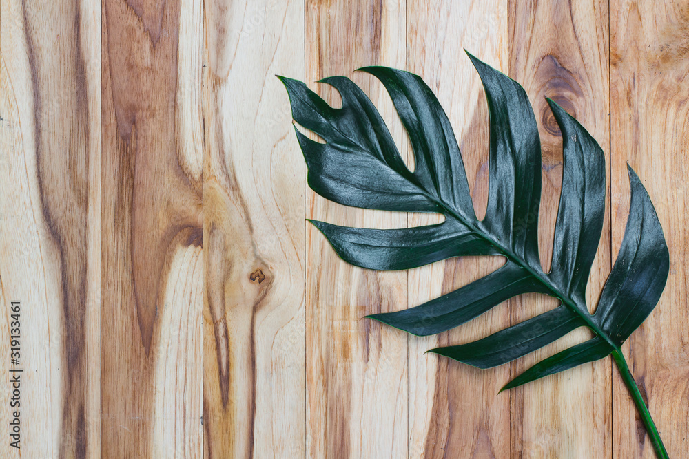 Monstera deliciosa leaf or Swiss cheese plant on a wooden background