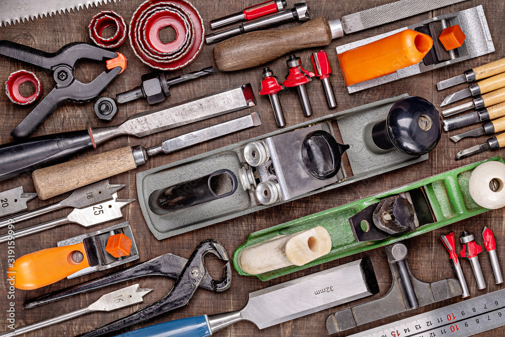 A set of different hand tools for wood for repair, DIY, construction and woodworking. Close-up, studio shot.