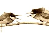 beautiful colored birds conflict isolated on a white background