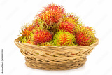 Close up fresh rambutan sweet and delicious fruit in basket isolated on white background.