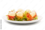 Close up fresh rambutan sweet and delicious fruit on plate isolated on white background.