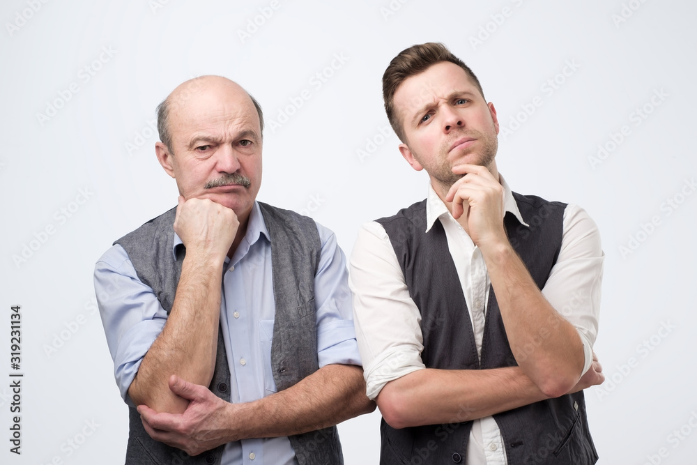 Serious two caucasian men hold chins being deep in thoughts, find way out of problem.