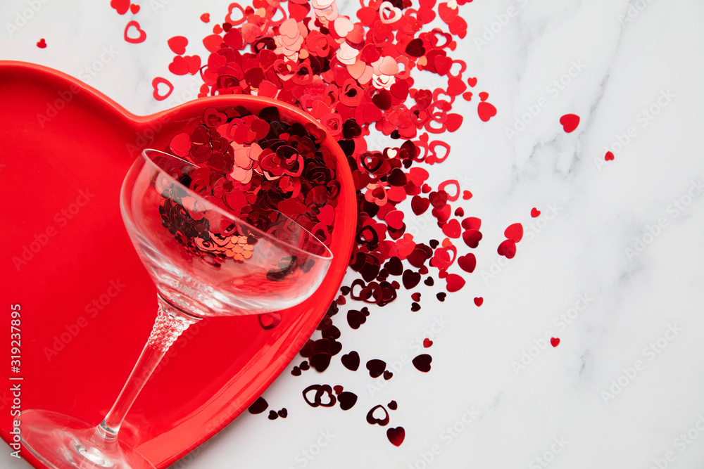 Valentine's dinner background. Red heart plate with champagne glass and confetti
