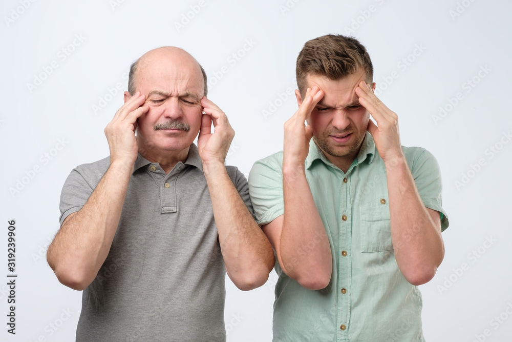 Displeased men keep fore fingers on temples, frown faces in discontent, suffer from headache.