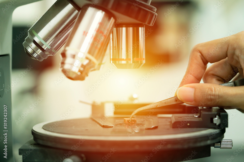 close up laboratory microscope, science and research concept