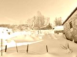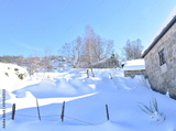 Mountain church Ermita de San Lorenzo after a snowfall with trees and blue sky. Piornedo Village, Ancares, Lugo, Galicia, Spain.