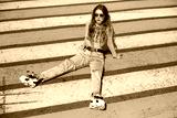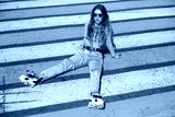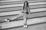 Bright exciting girl with red hair, 90s, 2000s style, T-shirt, wide jeans, bananas, sneakers. Sitting at a pedestrian crossing