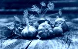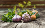 Gardening farming. Fresh organic vegetable garlic onion and spicy herb at old wooden table in rustic style side view.