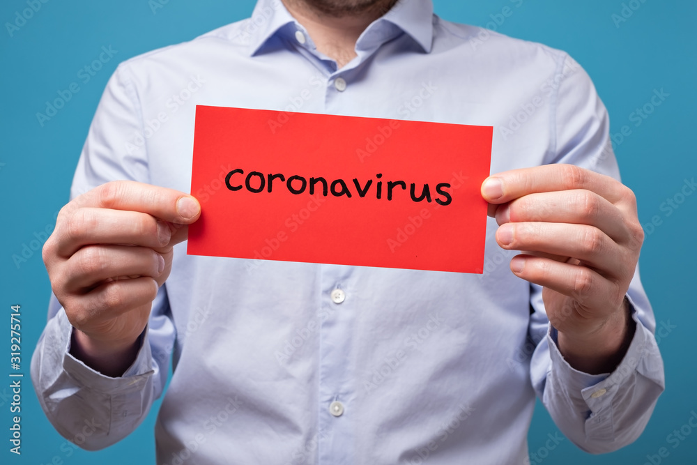 Caucasian man holding a red banner with a word coronavirus on blue background.