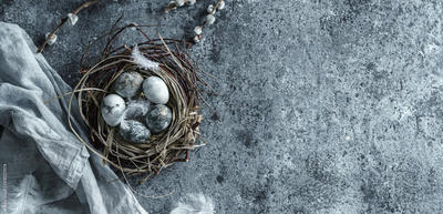 Marble Easter eggs in bird nest with feathers and spring flowers on blue background with napkin. Happy Easter holiday, top view, flat lay, wide composition