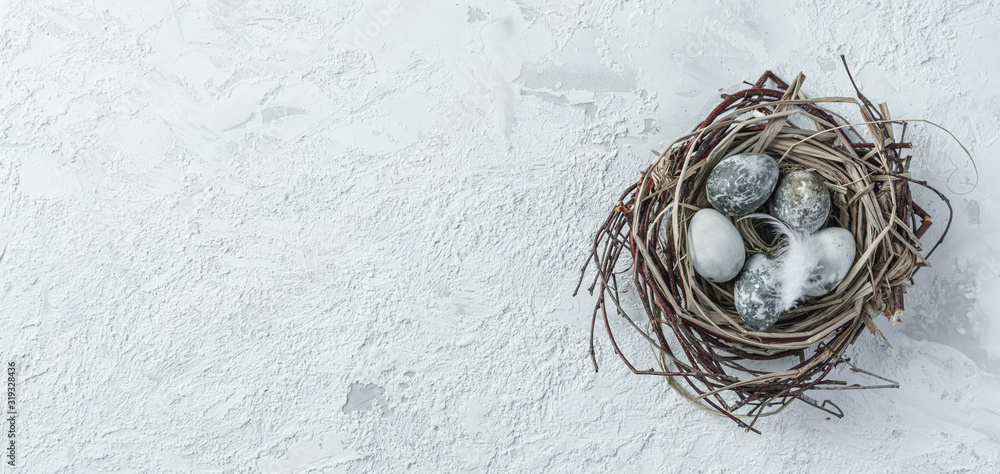 Easter eggs in bird nest with feather on white background with space for text. Happy Easter holiday, top view, flat lay, wide composition