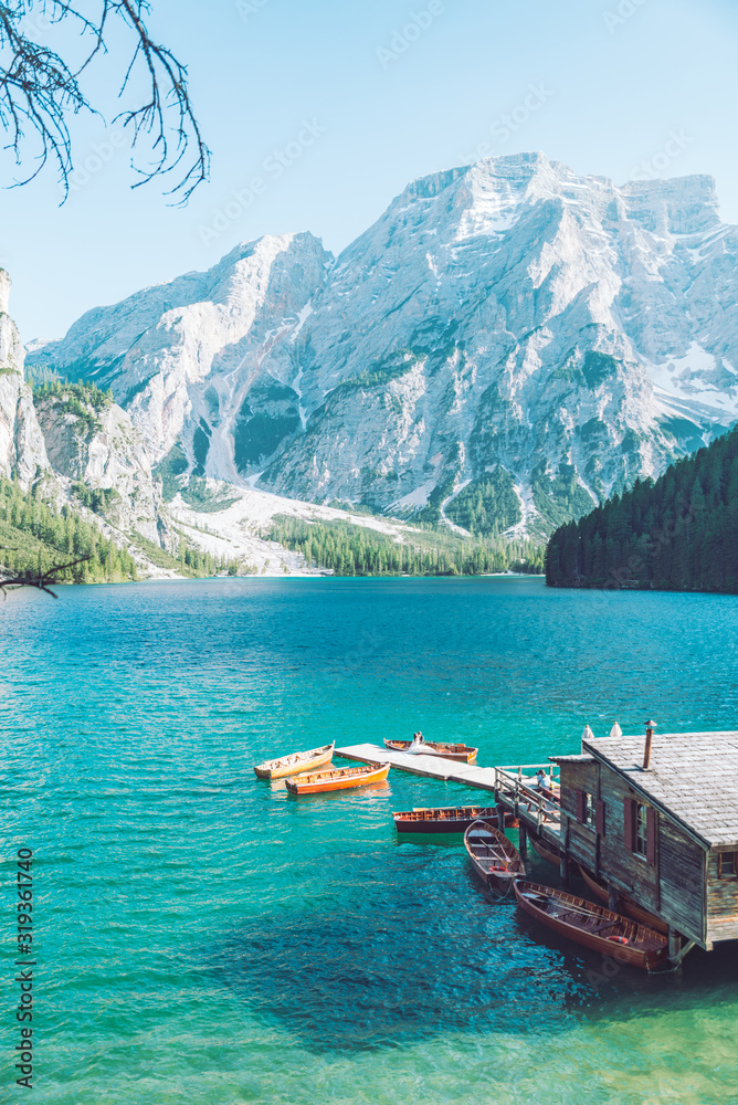 view of wooden house on water with pier and boats lake in dolomites mountains