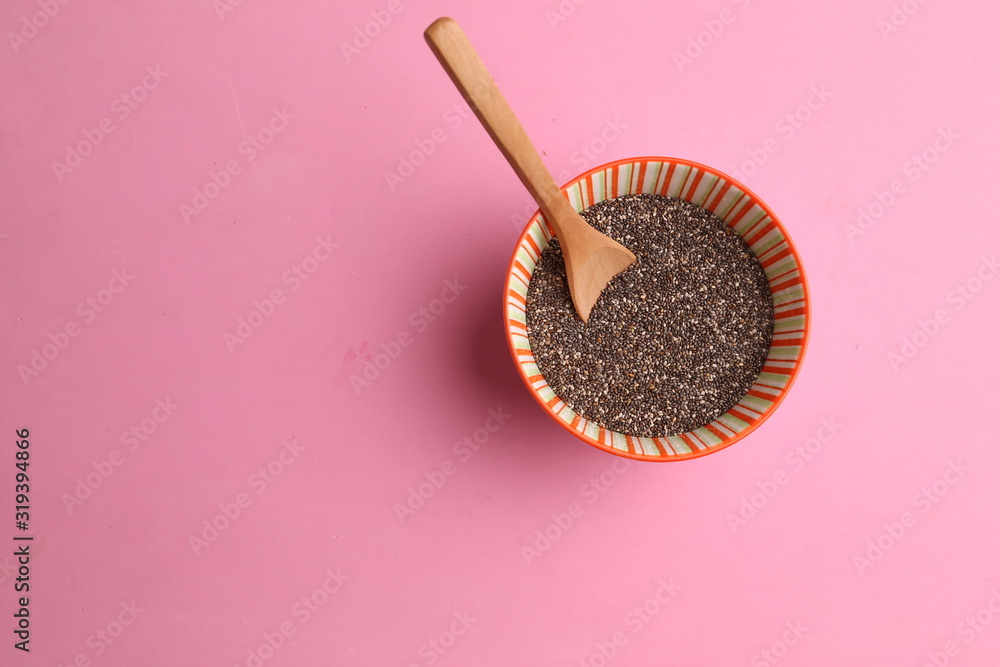 Bowl with chia seeds and wooden spoon
