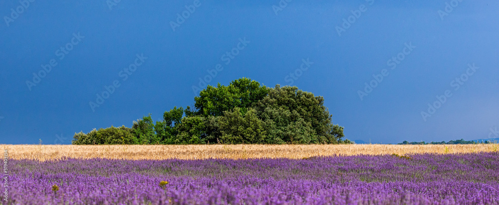 Picturesque lavender field and oat field against a bright blue sky. France. Provence. Plateau Valensole.