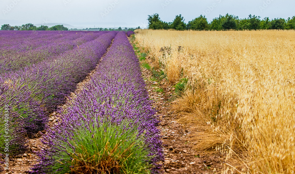 Picturesque lavender field and oat field. France. Provence. Plateau Valensole.