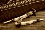 Two souvenir tobacco pipes and red Native American plaid. Copy space, studio shot.